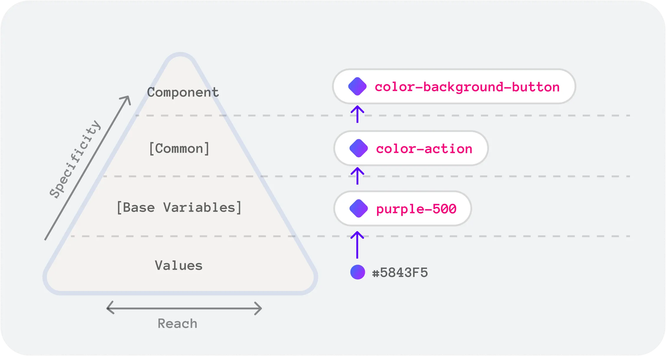 Lukas Oppermann (2022) collated and Jacob Miller (2023) ran a poll on Twitter about the various token level names . The levels are based on the fact that design tokens propagate through the system (Nathan Curtis, 2017) and brings visibility to the references as explained by Romina Kavčič (2022), Ishan Manandhar (2020) and Brad Frost (2018, 2022). Each author additionally explains the use-case or purpose for each group in their respective systems and with that concepts or patterns on how to use each group or their target area (eg. global vs local tokens). When before mentioned authors visualize the levels, they use a top to bottom rsp. bottom to top direction. Stefanie Fluin (2022) speaks about a pyramid and Oscar Gonzalez (2021) puts it into a visualization: